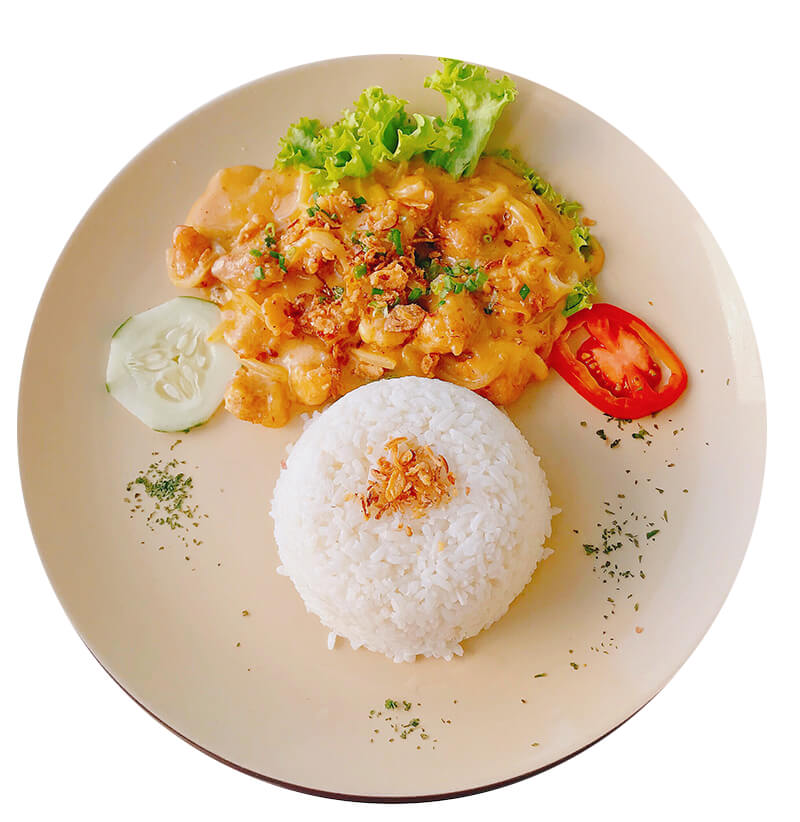 Pechuga de pollo cocida en una cremosa salsa de curry suave, acompa帽ada de arroz jazm铆n arom谩tico y cilantro fresco.
